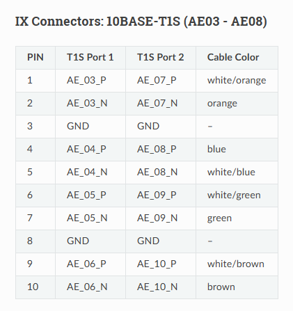 In pre-production units, IX connectors were used for the 10BASE-T1S ports. a chart with this pinout can be